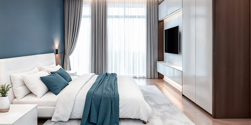 Bedroom Interiors Compact wardrobes, hydraulic beds, vanity units, and sliding door designs to make your bedroom cozy yet clutter-free.